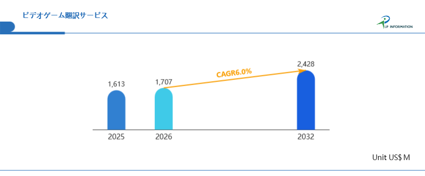 2026年3月,LP Information, Inc.(LPI)の最新調査レポート「世界ビデオゲーム翻訳サービス市場の成長予測2026~2032」は、過去の販売実績に基づいて2024年の世界全体のビデオゲーム翻訳サービス販売状況を分析し、地域別及び市場セクター別に2025年から2032年までの販売予測を提供しています。同レポートは、地域、市場セクター、サブセクター別に分類されたビデオゲーム翻訳サービスの売上を百万米ドル単位で詳細に分析しています。